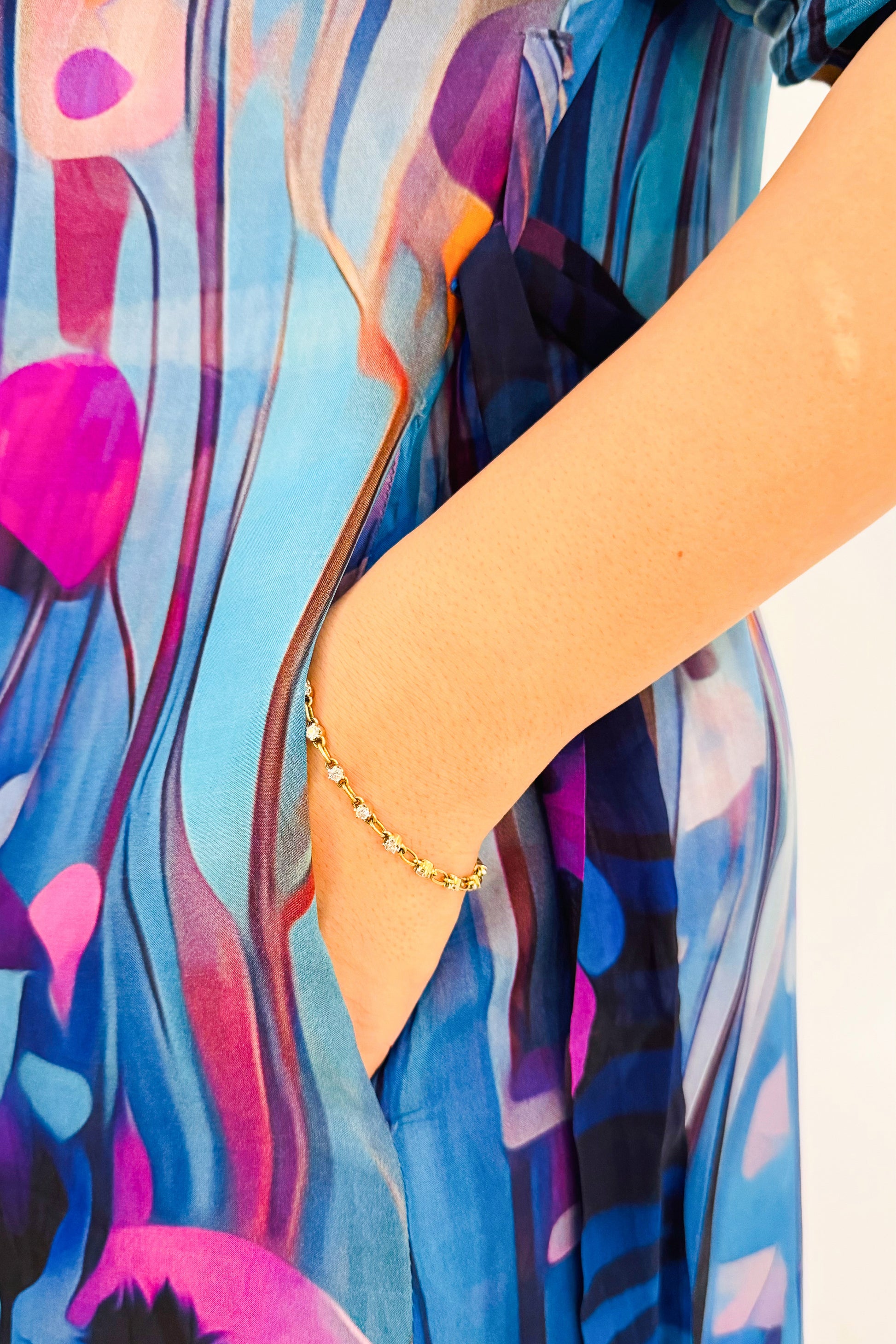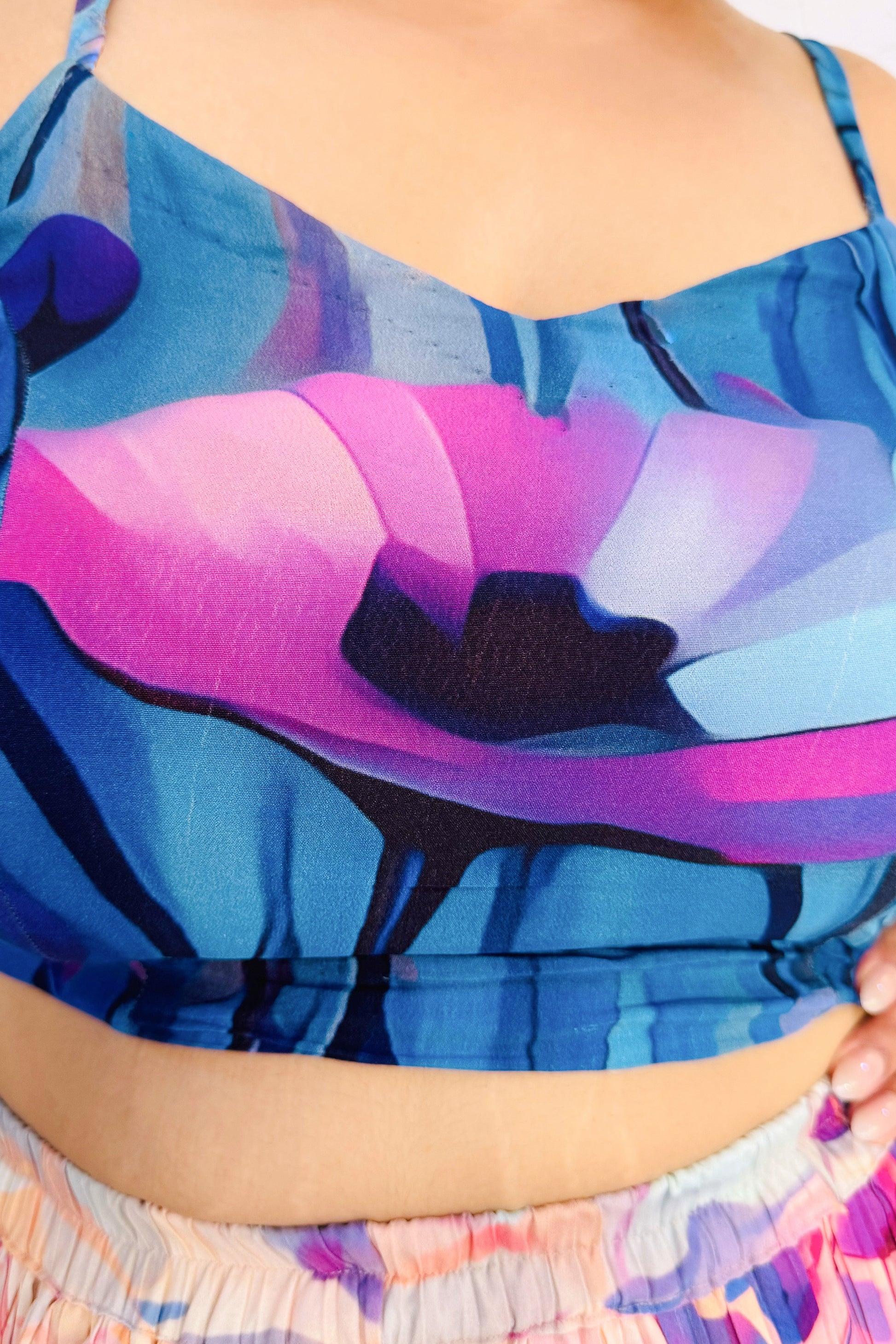 A stunning ensemble featuring a vibrant abstract floral print inspired by Blue Poppies from the Valley of Flowers, India.