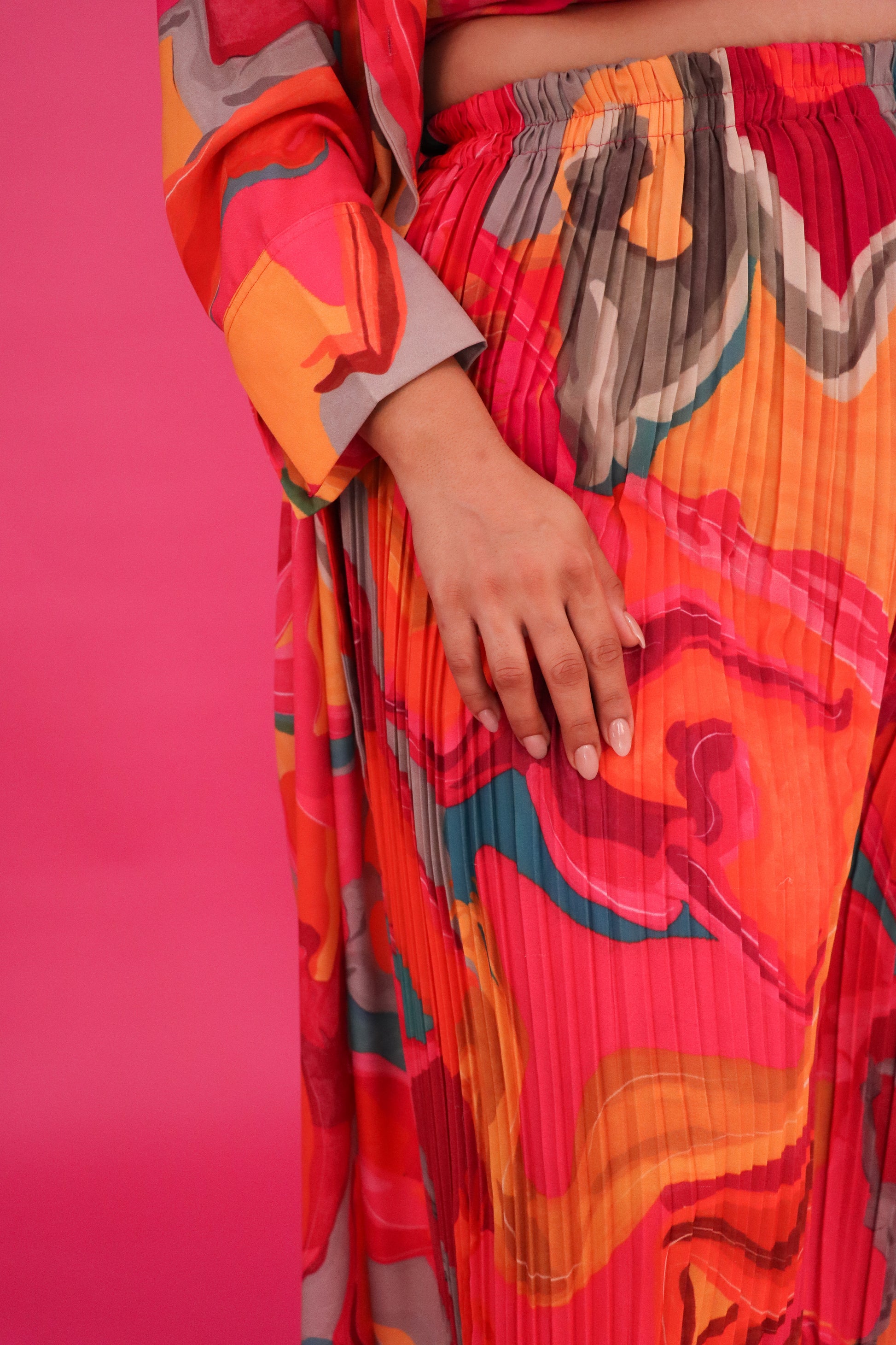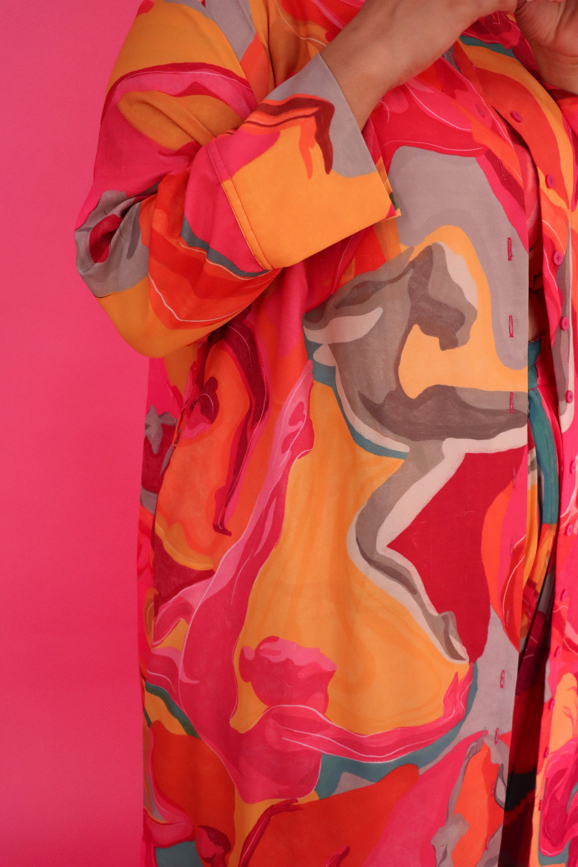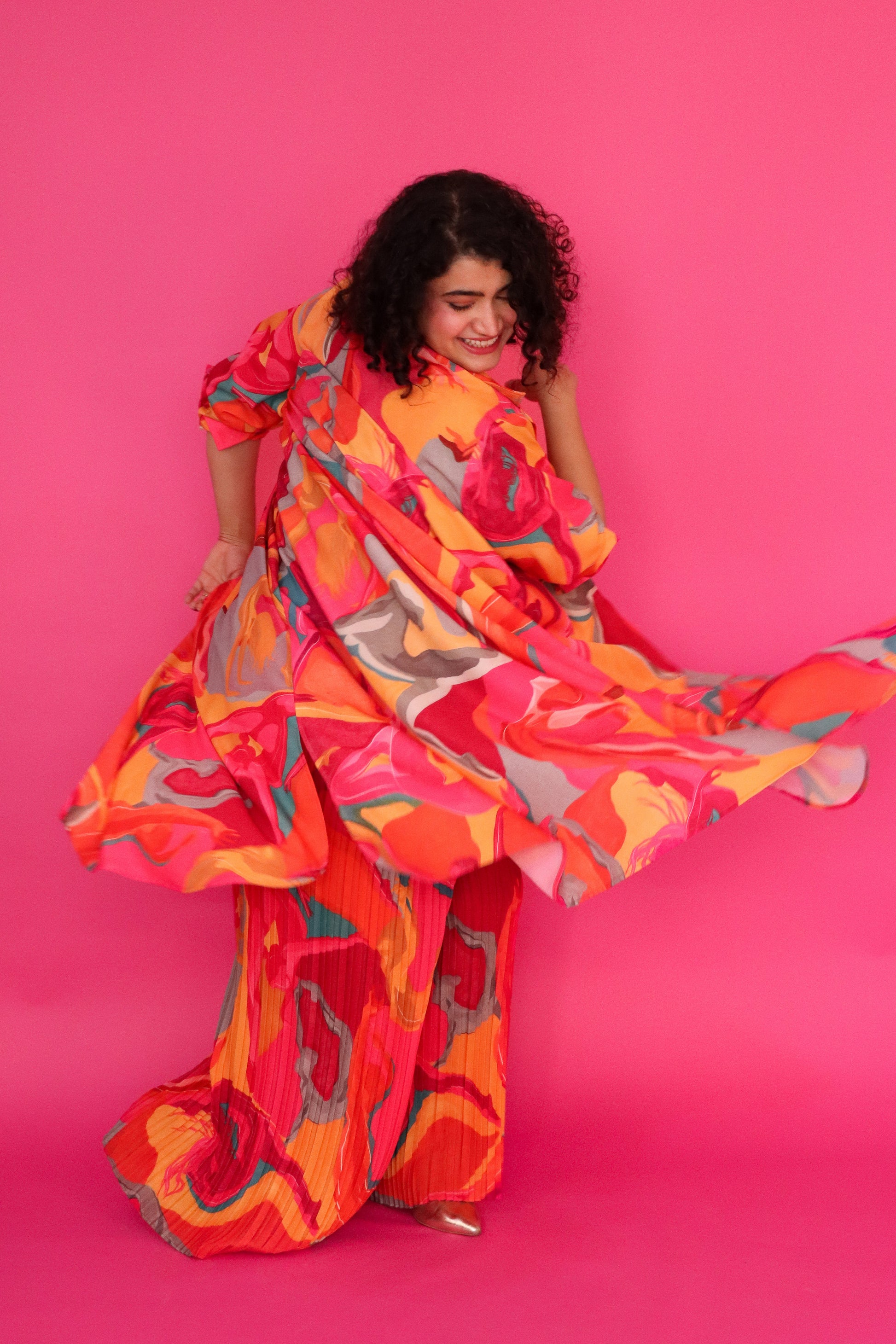 This vibrant ensemble, features a lively abstract print in pinks, oranges, and reds.