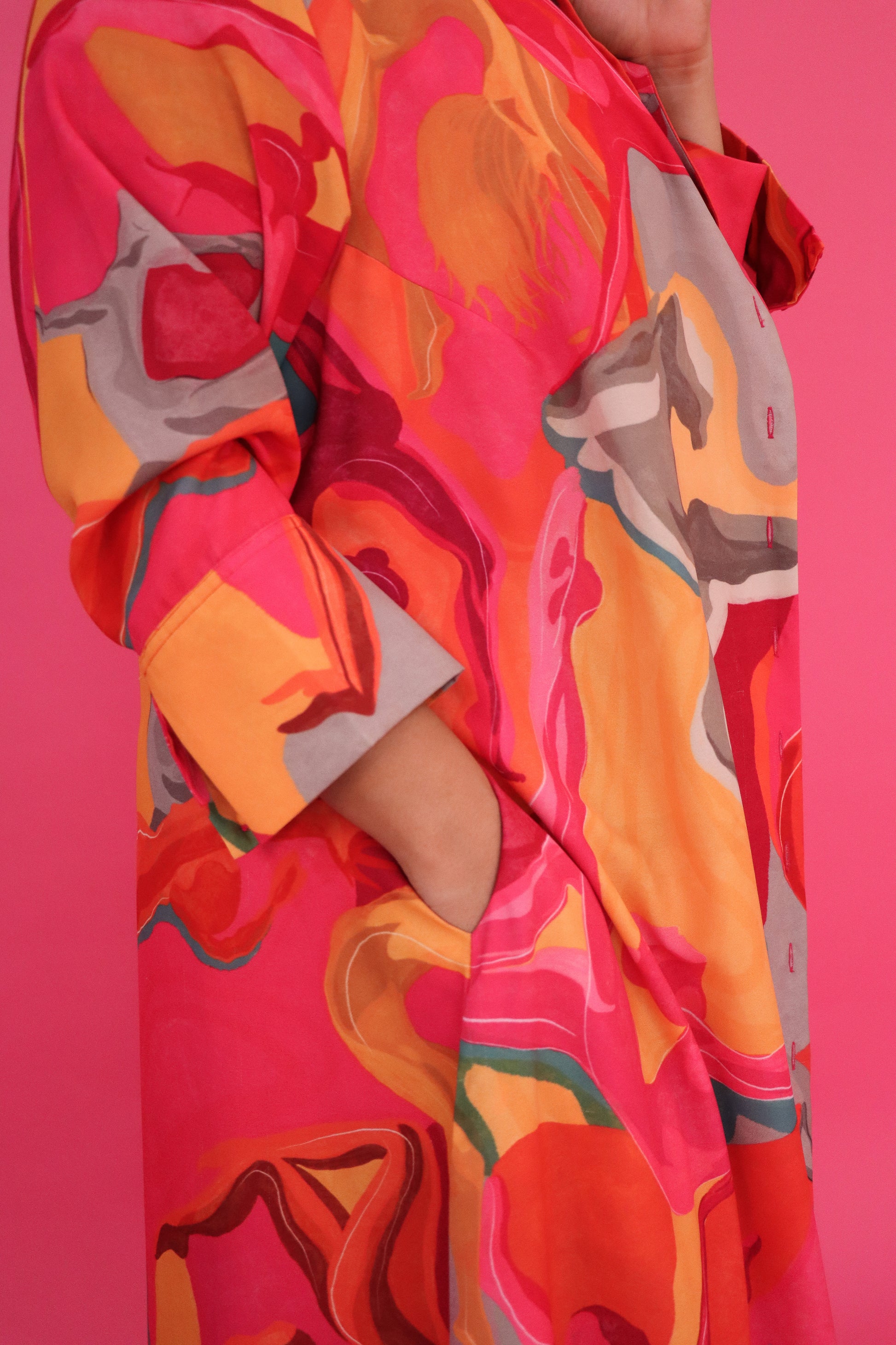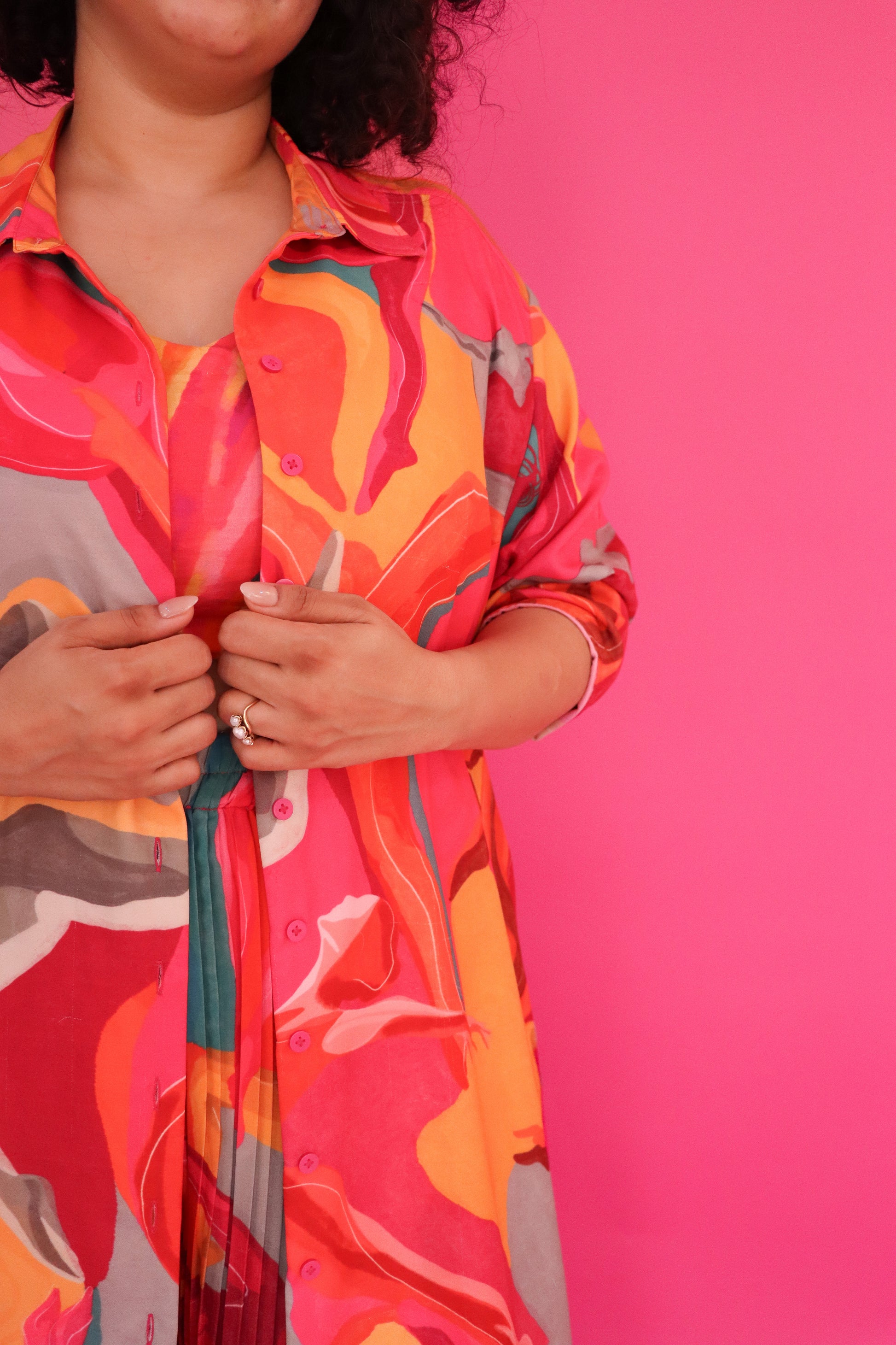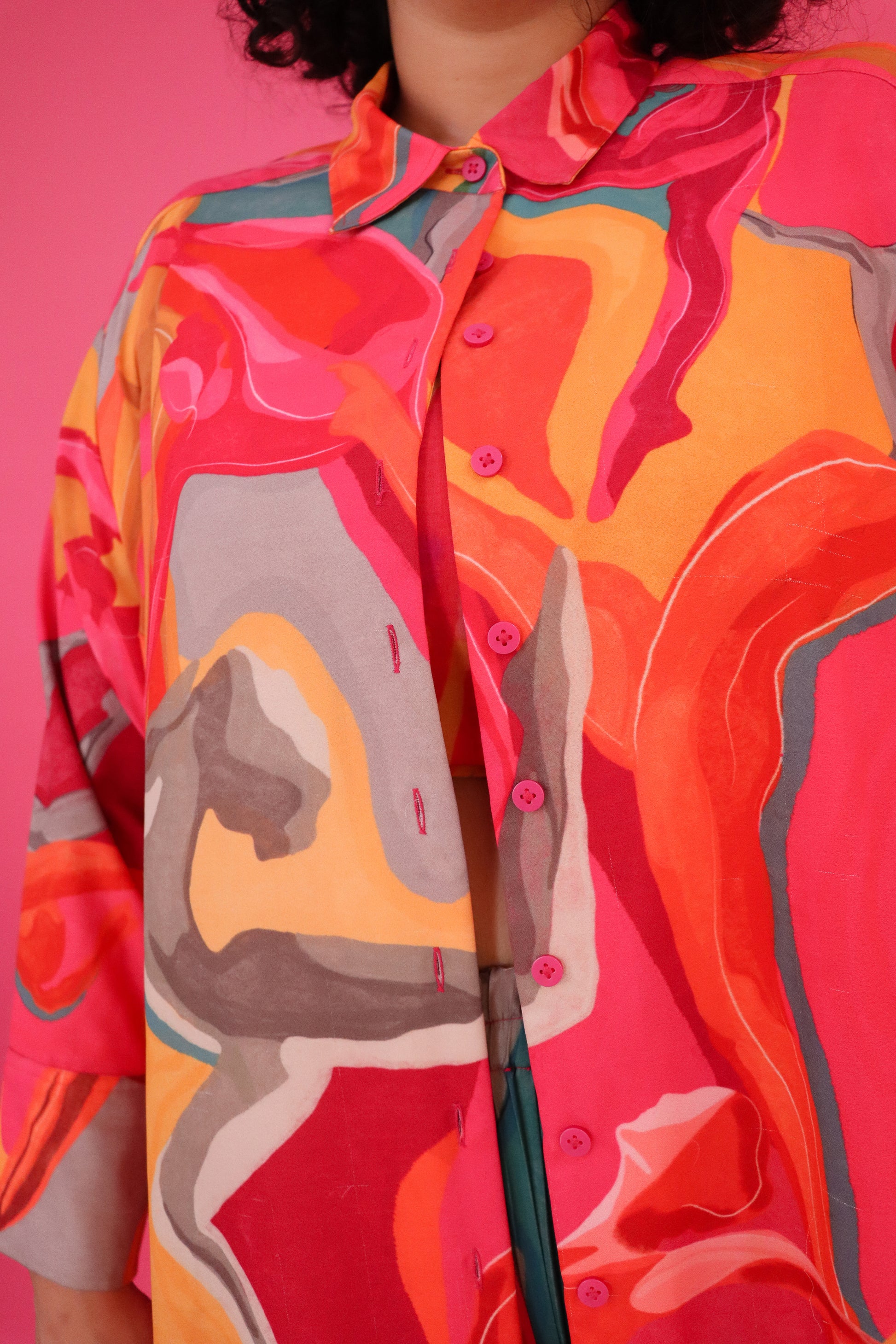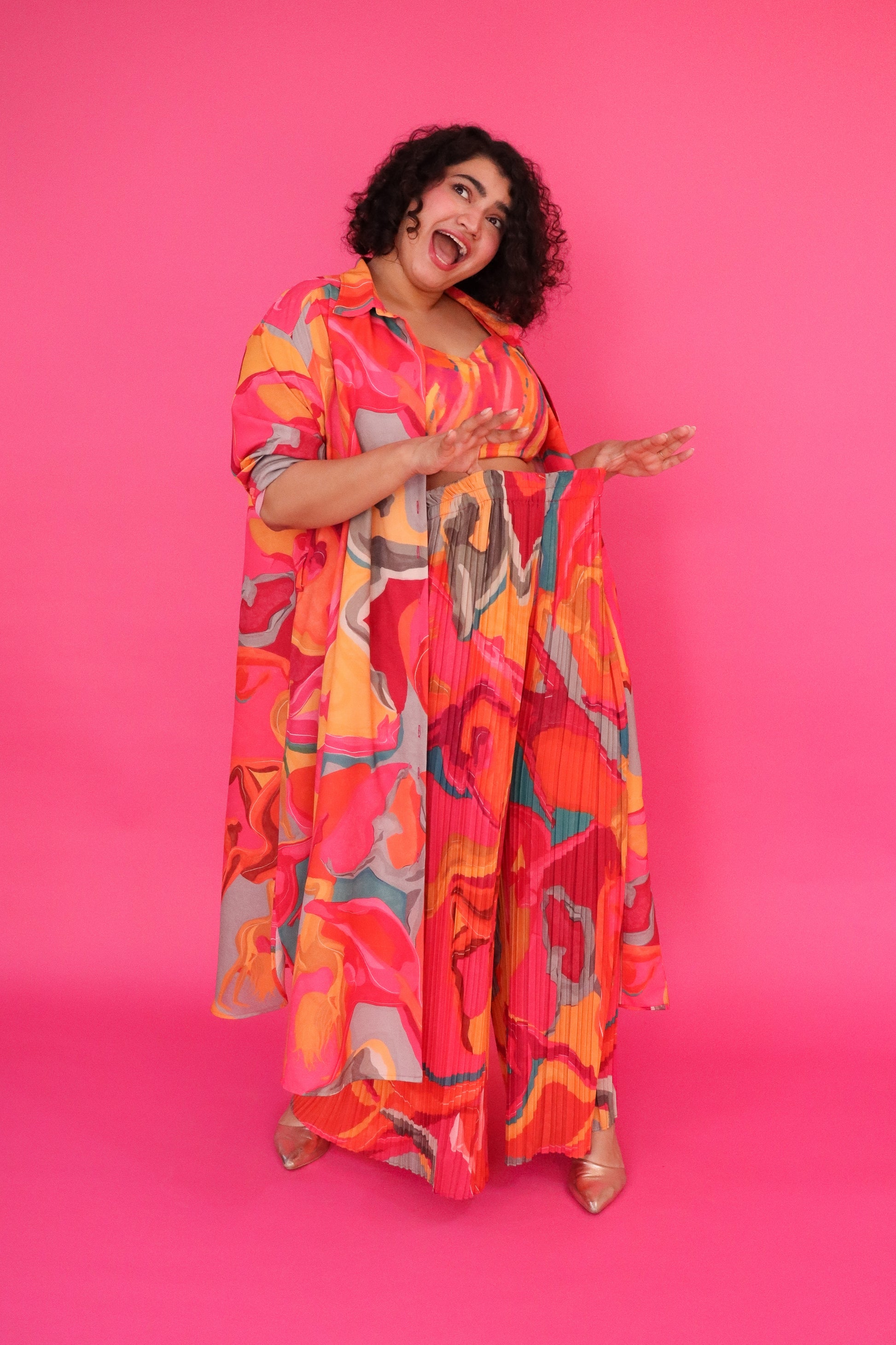 This vibrant ensemble, features a lively abstract print in pinks, oranges, and reds.