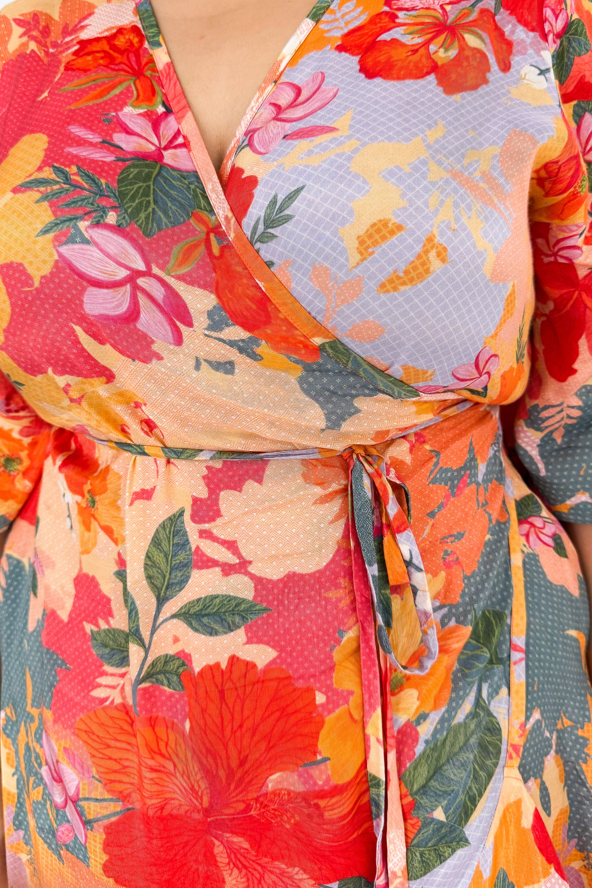 Embrace the vibrant beauty of nature with the Indian Flower Wrap Dress. This stunning wrap dress features a lush floral print inspired by the rich flora of India, blending warm hues of red, orange, and yellow with touches of green and pink. The wrap design accentuates your curves while offering a comfortable and adjustable fit, making it perfect for plus-size women who value both style and ease. With its flowing silhouette and lightweight fabric, this dress is ideal for everything from casual brunches to festive gatherings.