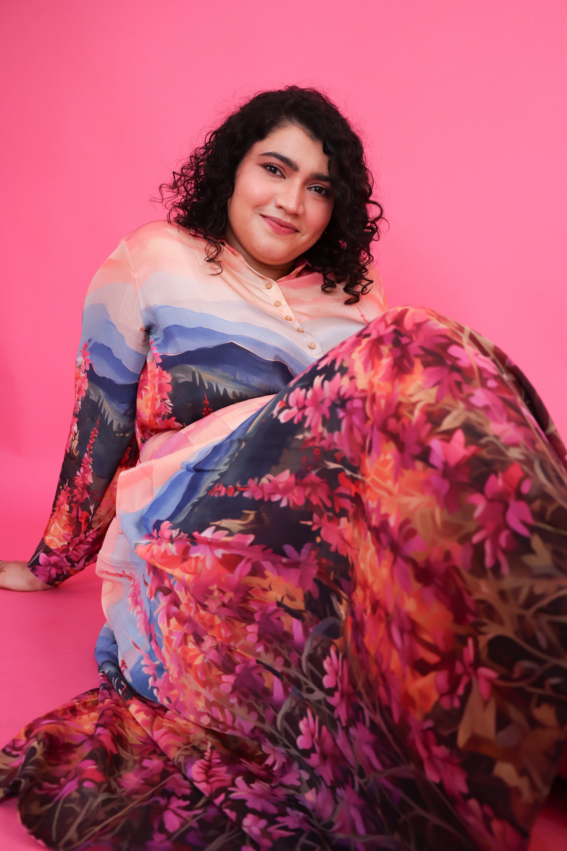 Feel like a walking landscape in the Lupine Valley Skirt Set. This two-piece ensemble features a classic button-down shirt and a pleated skirt, adorned with a stunning print inspired by the blooming Lupine fields against a mountain backdrop. Crafted from buttery soft viscose crepe, this set is perfect for a day out in the sun, offering a comfortable yet stylish fit. The vibrant hues of pink, purple, and blue make this outfit an absolute showstopper, bringing nature's beauty to your wardrobe.
