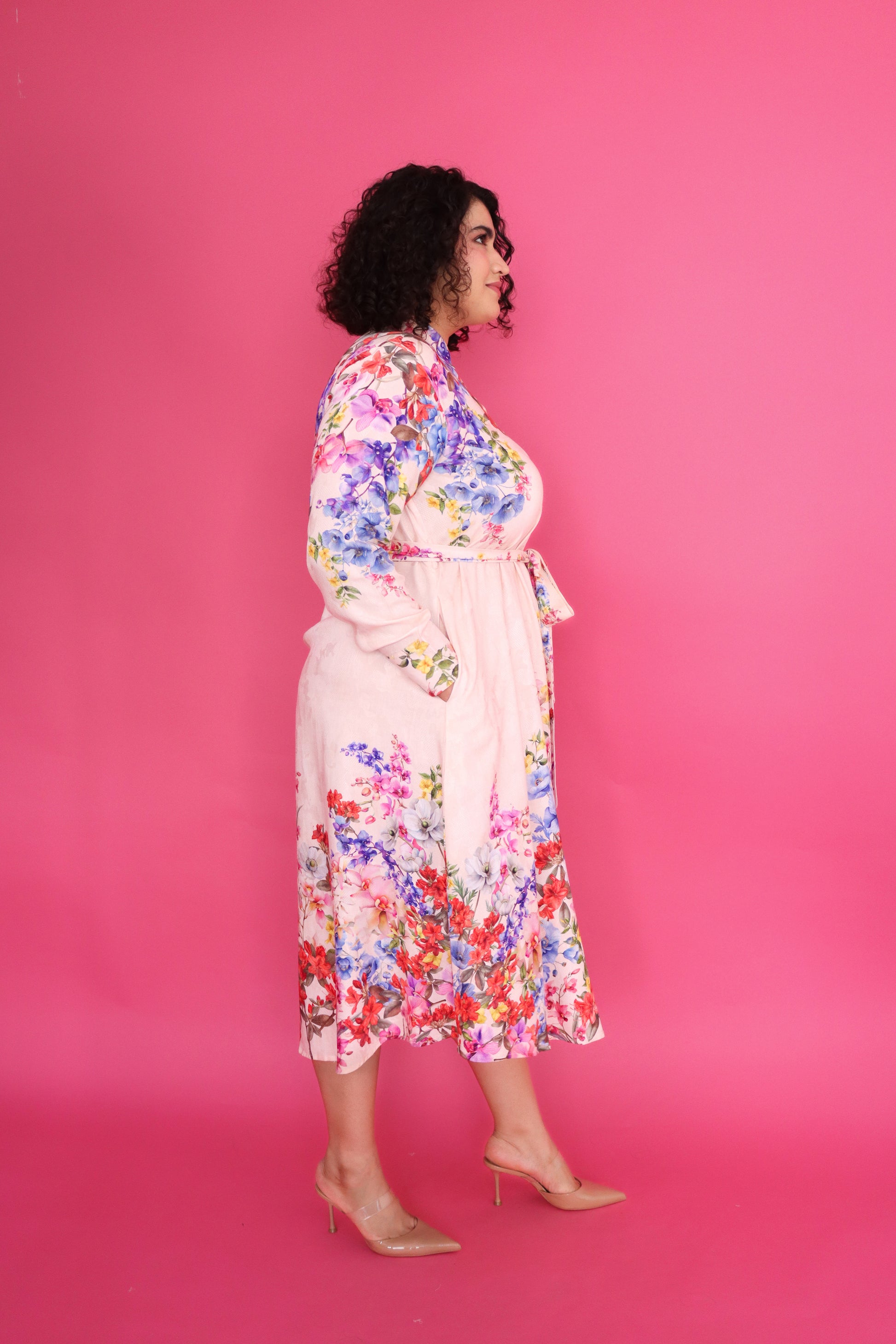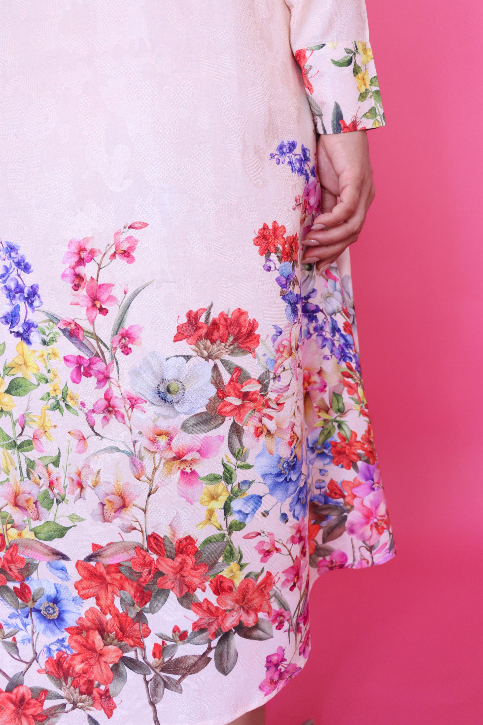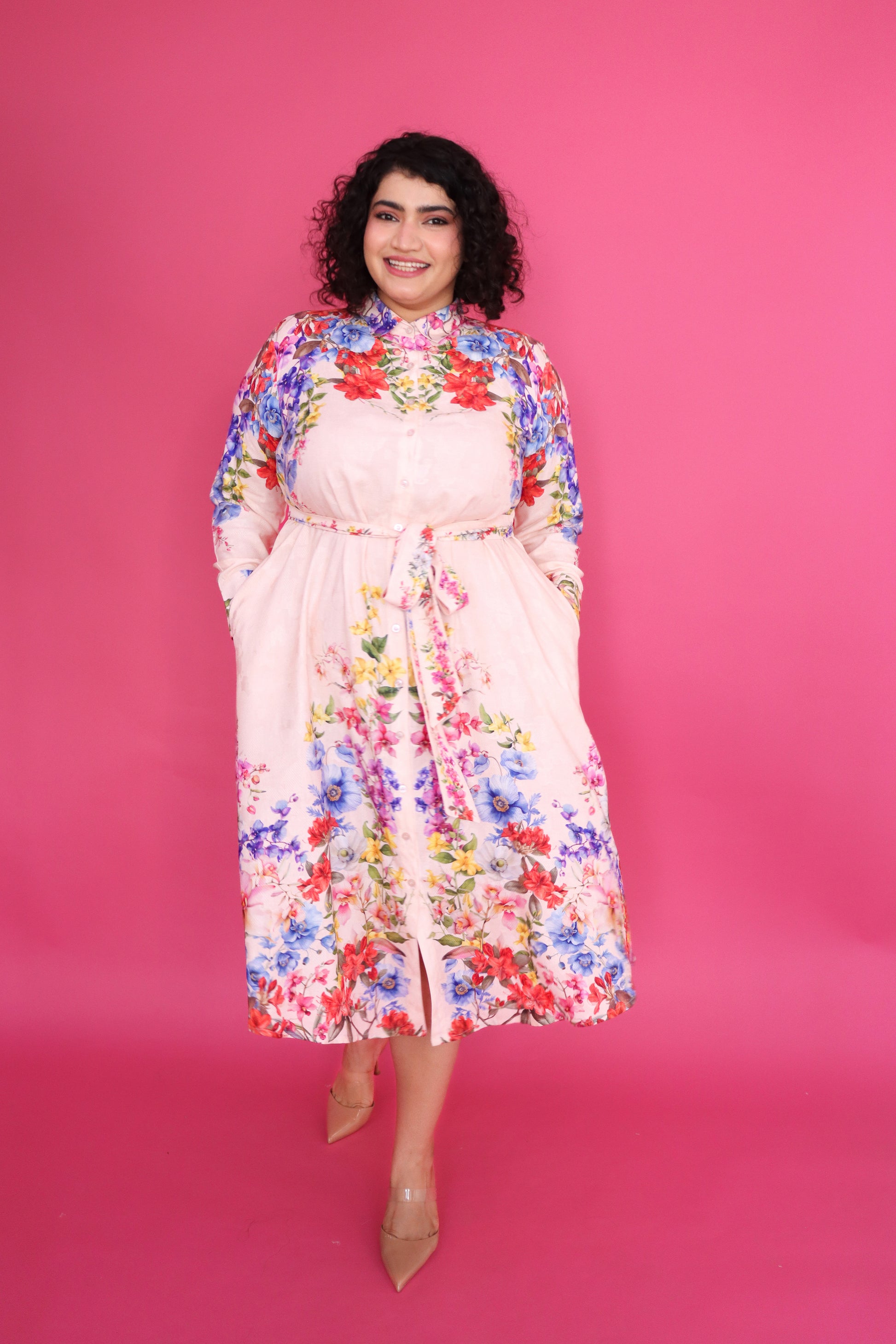 This Valley of Flowers Shirt Dress is a timeless blend of elegance and functionality. Inspired by the floral beauty of Uttarakhand’s Valley of Flowers, it features a delicate placement print that exudes charm. Designed with a classic shirt collar, functional cuffs, extra buttons to prevent gaping, and convenient pockets, it ensures both style and comfort. The rounded hem adds a feminine flow, while the matching fabric belt cinches the look perfectly. Effortlessly transition from day to night, making it the ideal choice for work, vacations, or any occasion.