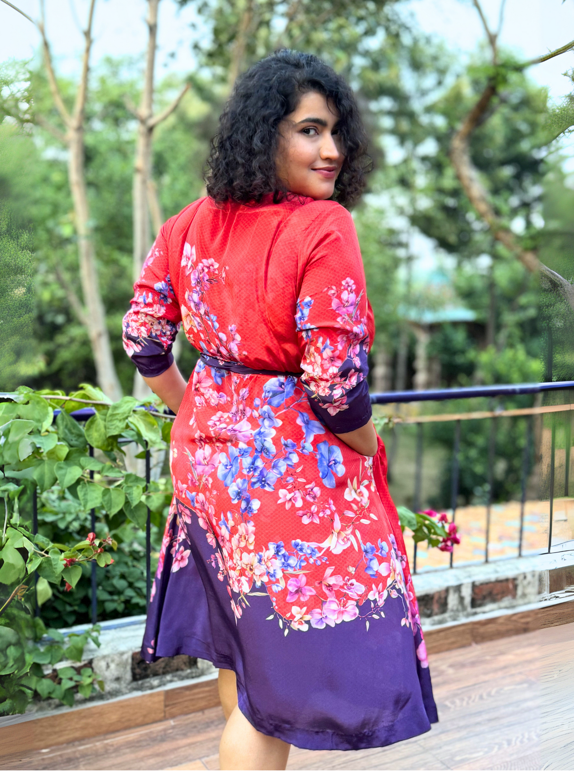 The Orchid Petal Dress captures both grace and boldness through rich hues and fluid drape. Crafted in breathable viscose crepe, it features hand-drawn orchids blooming across a red and wine-toned backdrop, blending depth and softness in every detail. The flattering wrap silhouette ties at the waist for an adjustable fit that complements your shape. With 3/4th sleeves and a graceful fall, this piece brings ease and sophistication to everything from alfresco dinners to late summer soirées.