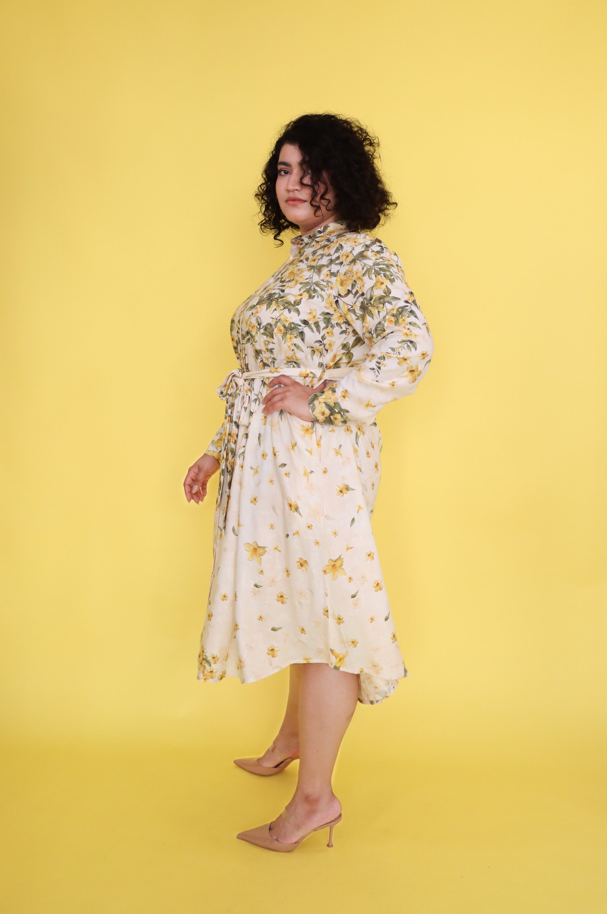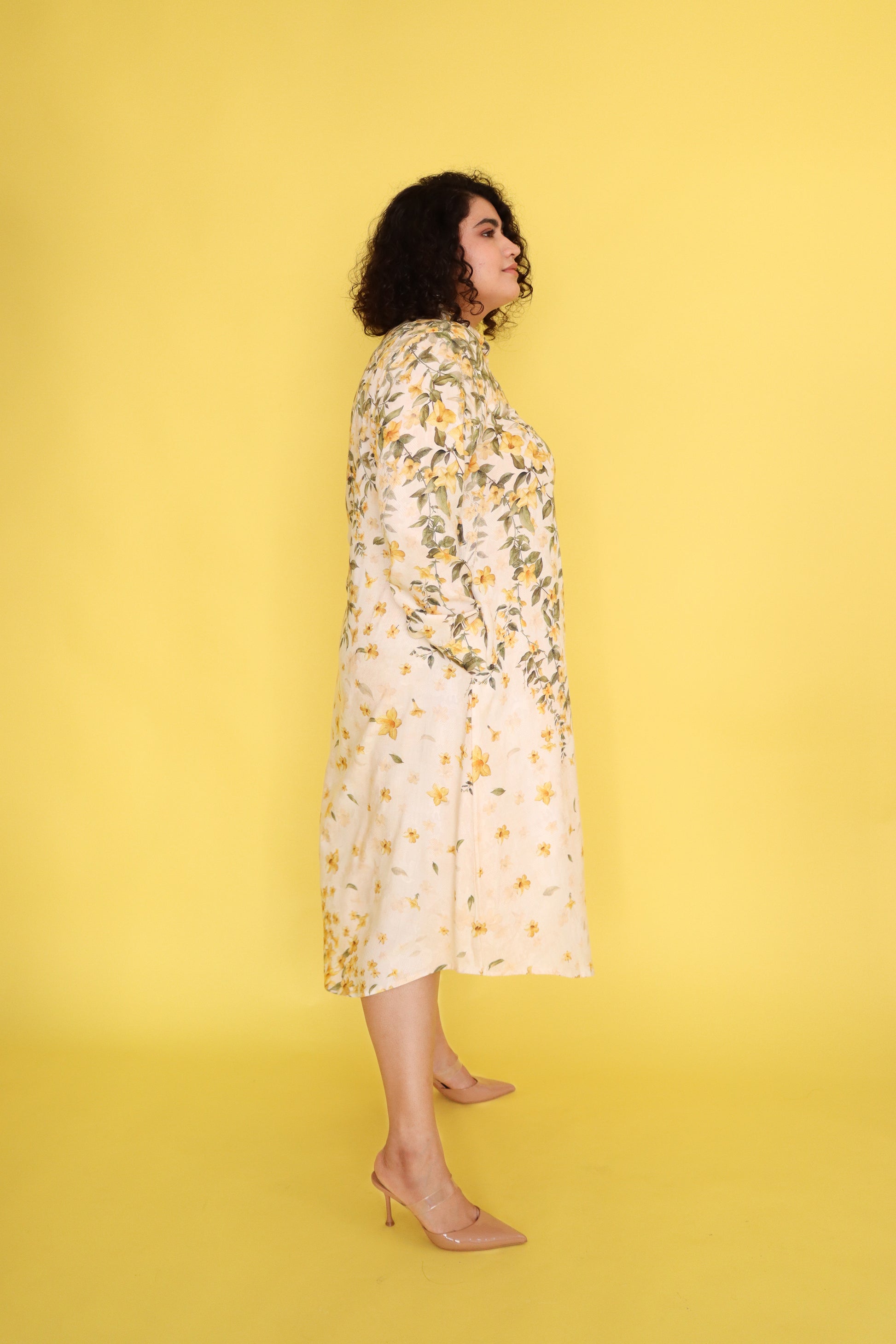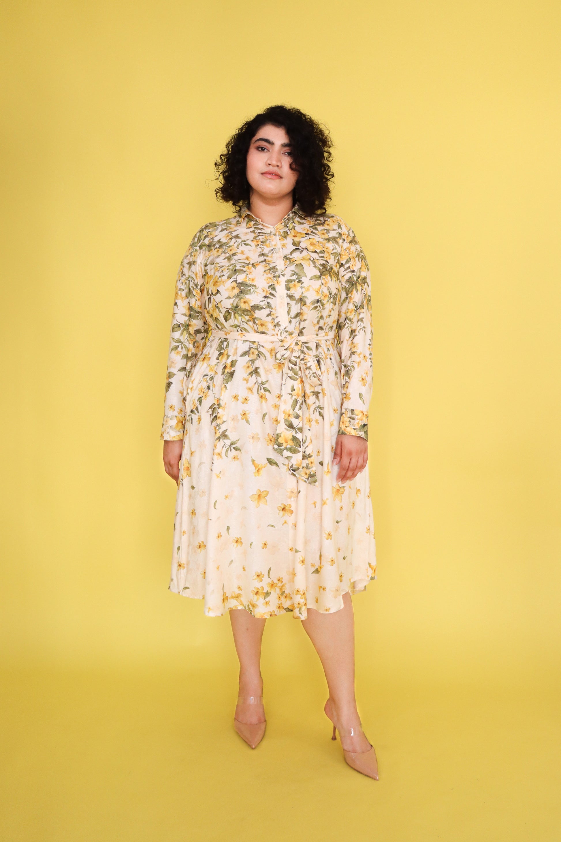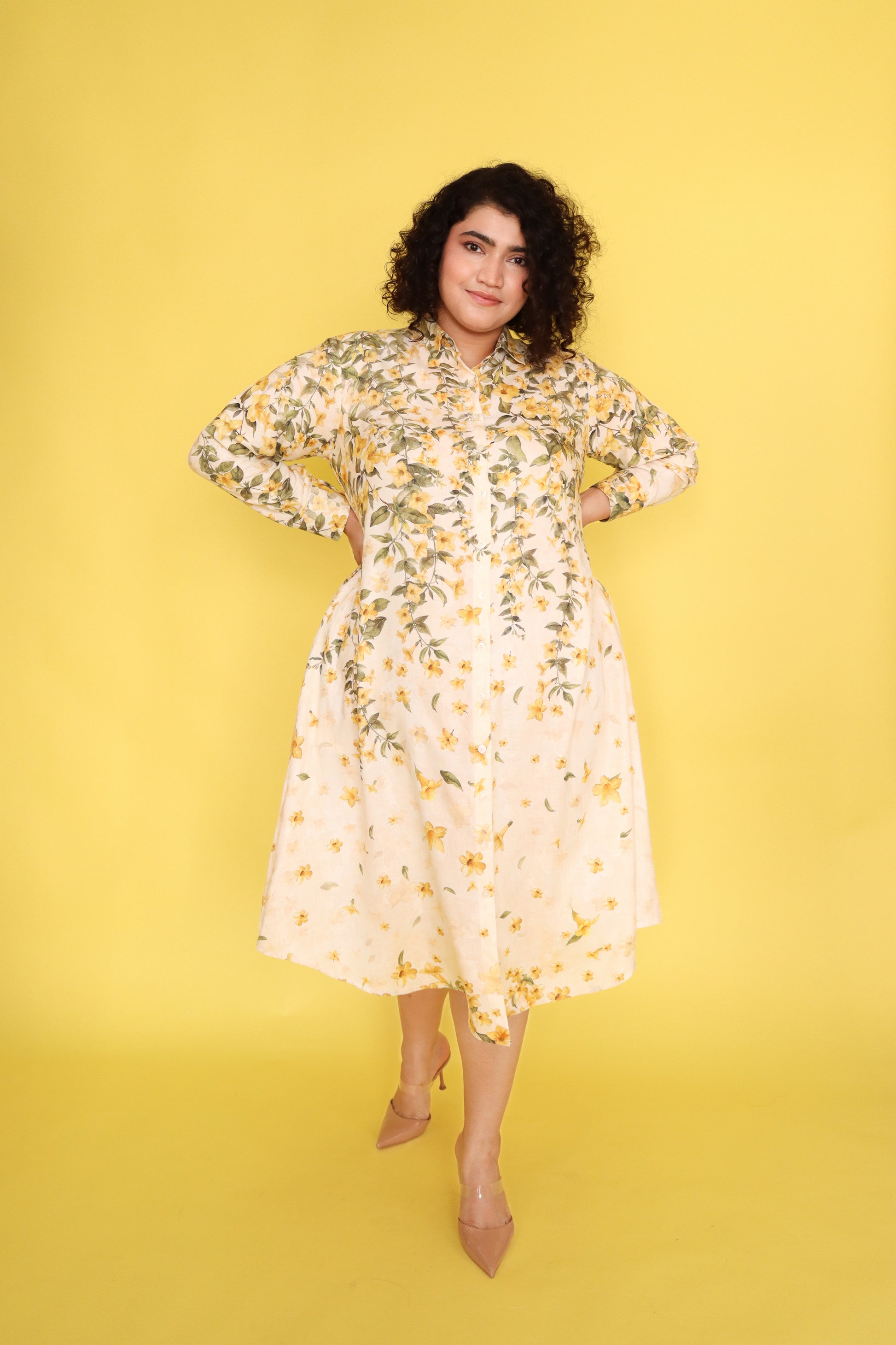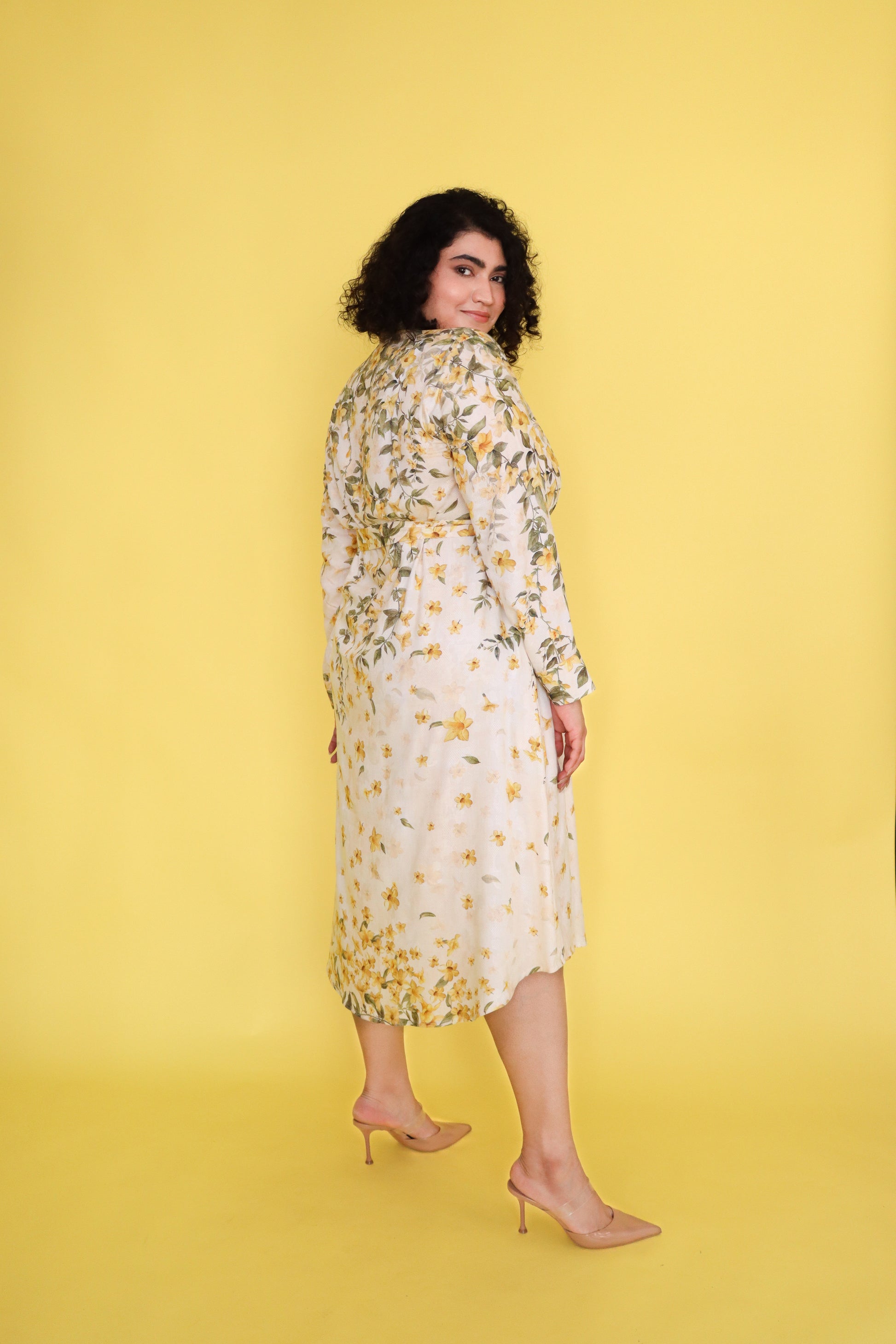 Embrace easy elegance with the Yellow Jasmine Shirt Dress, featuring delicate jasmine flowers cascading down the soft viscose jacquard fabric. With its luxurious handfeel, this dress is designed for both comfort and style. Features include a shirt collar, front opening with extra buttons to prevent gaping, rounded hem for a perfect fit, functional cuffs, and pockets for added convenience. Comes with a matching fabric belt to complete the look. Perfect for any occasion, from casual outings to semi-formal events.